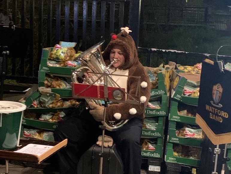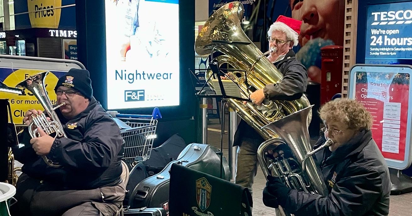 The band plays carols for passersby outside Tesco Extra, Watford.